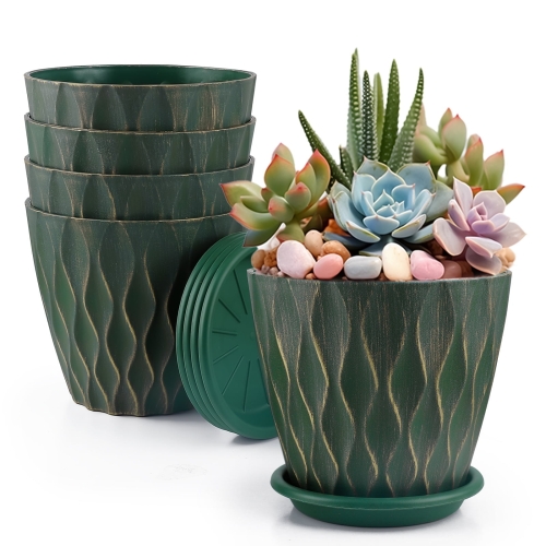 FOUKUS 6 inch Plastic Plant Pots: 5 Pack Indoor Planters with Drainage and Tray Outdoor Flower Pots, Green Gold