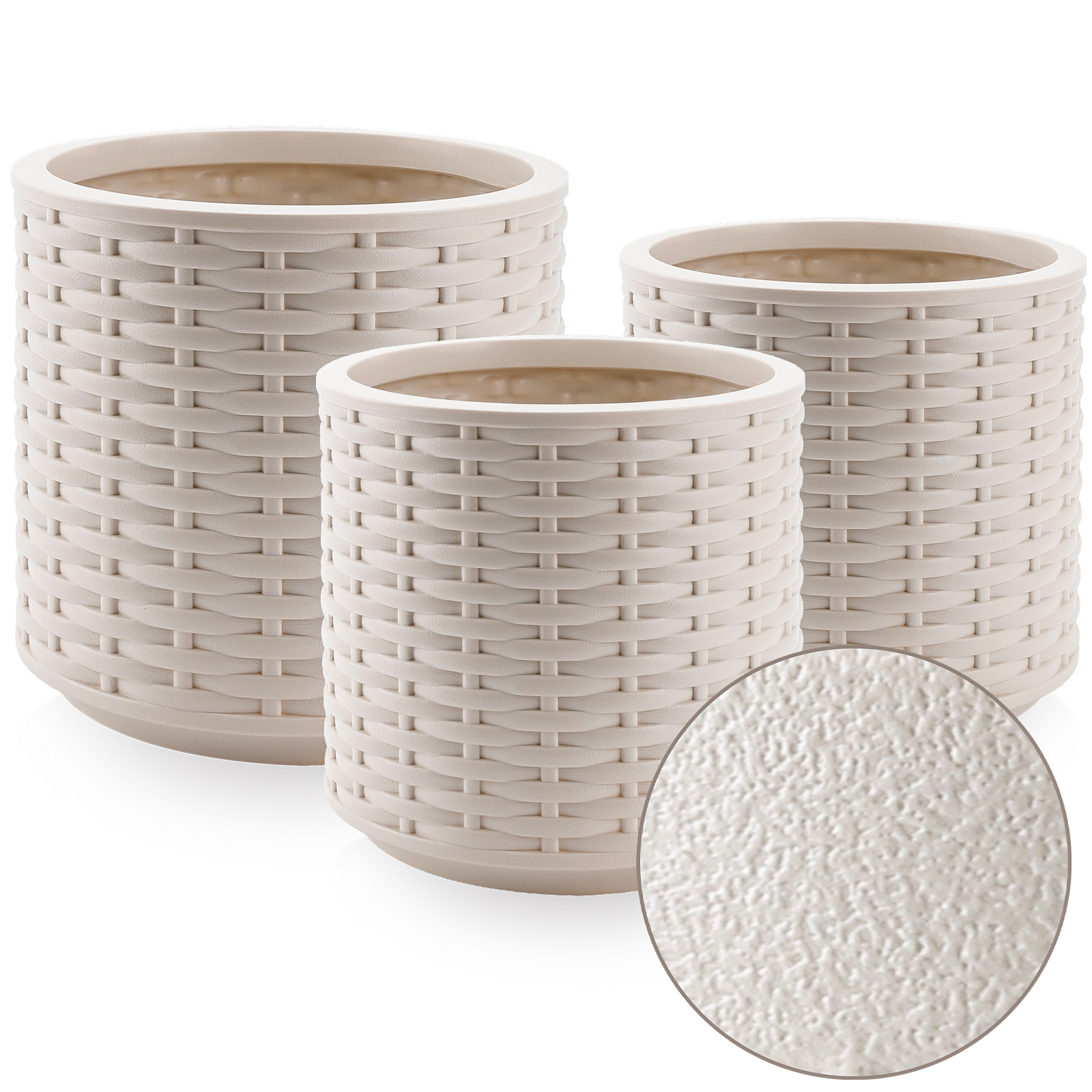 Suitable for both indoor and outdoor use, each planter includes a drainage hole to support healthy plant growth. From living rooms to patios and gardens, this woven texture planter set balances decorative detail with everyday practicality.