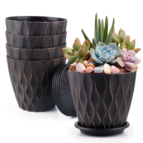 FOUKUS 6 inch Plastic Plant Pots: 5 Pack Indoor Planters with Drainage and Tray Outdoor Flower Pots, Black Gold