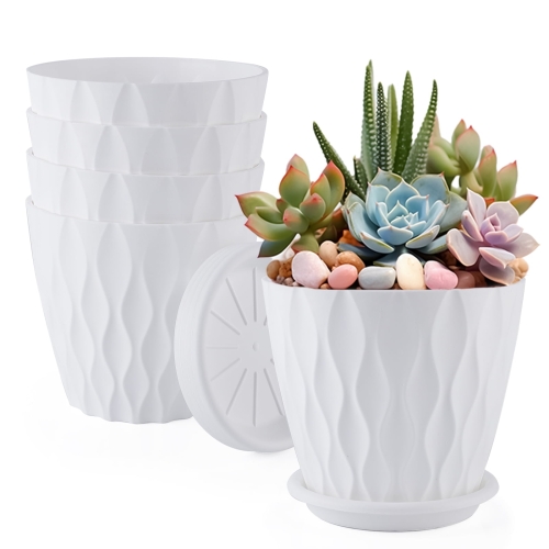 FOUKUS 6 inch Plastic Plant Pots: 5 Pack Indoor Planters with Drainage and Tray Outdoor Flower Pots, White